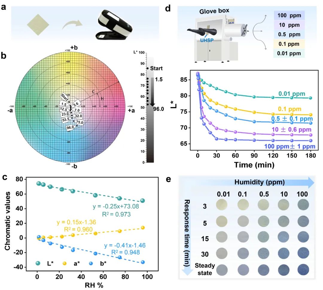 圖2. UHSP對高濕度(1.5–96% RH)的線性比色行為及對超低濕度(0.01–100 ppm)的響應性。