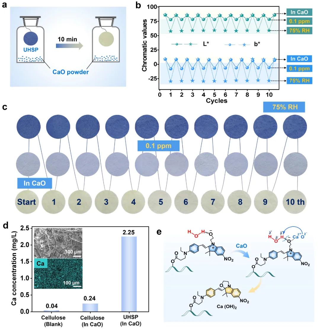 對于能夠檢測超低濕度的傳感器來說,發展經濟和環境友好的再生(即二次利用)方法一直是科研和市場的迫切需要。本文作者巧妙利用氧化鈣(CaO)的“非常規升華”及“生石灰消化”性質,簡便、高效地實現了UHSP的再生與多次循環利用。如圖3a所示,感濕后藍色的UHSP 懸掛于盛裝CaO粉末的密閉容器上方(稱之為“CaO 氛圍”),僅需十分鐘內就可恢復到最初的淡黃色。無論響應高濕度(75%RH)還是超低濕度(0.1ppm)后,再放置“CaO 氛圍”恢復,這些過程重復循環10次以上,UHSP的性能均未見有明顯衰退(圖3b,c)。電感耦合等離子體發射光譜(ICP-ES)測試結果表明,UHSP在“CaO氛圍”中放置后的Ca含量與放置前相比顯著增加,并且在能量色散光譜(EDS)分布中可以清楚地觀察到Ca 元素(圖3d)。根據這些測試結果,可推測其再生機理如圖3e所示:由于響應濕度后的UHSP上開環NO2-OX單元的氧負離子的靜電作用,使CaO以“類升華”的方式吸附到UHSP上,其通過“石灰消解”反應消耗了結合水。與此同時,開環的NO2-OX單元由于失去了水的氫鍵輔助和受到“石灰熟化”放熱影響,傾向于恢復到熱力學更穩定的閉環形態,從而恢復至初始的淡黃色狀態。