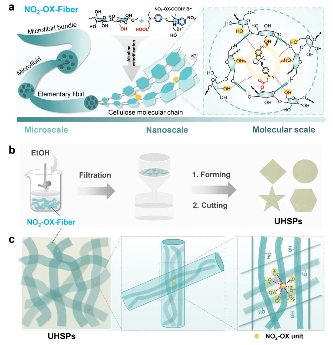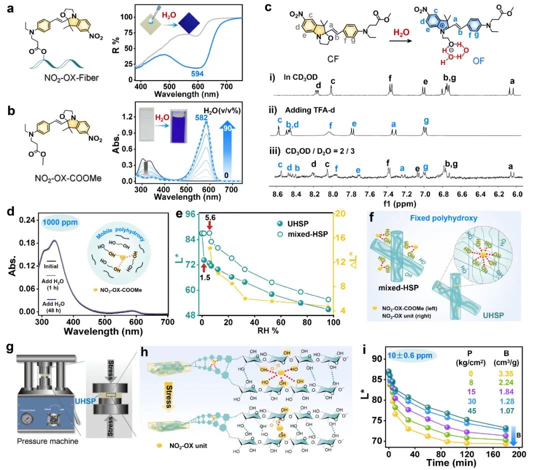 圖1為UHSP的設計與制備示意圖。水致變色分子開關是一類在水的刺激下能從關環無色態到開環顯色態逐漸并完全轉換的一類“新興”分子開關,它由盛蘭/張曉安團隊率先提出與報道(Nat. Commun., 2014, 5, 3044)。作者根據前期工作經驗,將含有羧基的水致變色分子開關NO2-OX的前體分子(即NO2-OX-COOH+ Br-)在堿性條件下與具有多級結構的纖維素微纖維的葡萄糖單元上的伯羥基發生酯化,從而NO2-OX單元得以固定在含有多個羥基的立體微環境中(圖1a)。將制得的接枝有NO2-OX開關的水致變色微纖維(NO2-OX- Fiber)分散到乙醇溶液中,再經過“類造紙”工藝(過濾、干燥、裁剪)處理,即可得到不同形狀的UHSPs(圖1b)。通過這種“自下而上”的構建方法,UHSPs中的每個NO2-OX單元不僅可以受到來自同一微纖維束的“鄰近”羥基的影響,還可受到來自不同微纖維束的“遠程”羥基的影響(圖1c)。因此,這種“類酶”構建方法可以提供多級次和多方向的多羥基(或氫鍵)網絡微環境,這有利于NO2-OX開關單元的開環,以實現預期的超低濕度裸眼可視化檢測。