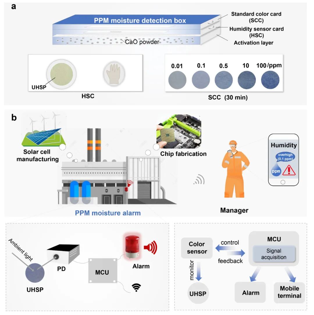 基于UHSP對濕度的高靈敏度和明顯的顏色變化,通過集成標準色卡(SCC)、基于UHSP的濕度傳感器卡(HSC)和活化層(即CaO粉末),可開發便攜式ppm濕度檢測盒(圖5a)。通過對比HSC與SCC的響應狀態,實現環境中超低 (0.01-100 ppm) 濕度的肉眼視覺檢測。此外,將UHSP與顏色傳感器、微控制器單元 (MCU)、報警器裝置和智能終端 (如手機)集成在一起,可以開發出多功能的ppm級濕度監測和報警裝置(圖5b)。一旦測試環境中的水分含量達到或超過預設的報警濕度值,就會迅速觸發報警裝置。現場和遠程管理人員可以通過報警聲或智能終端及時得到信息反饋,實現高效的遠程控制。PPM級濕度報警器有望在芯片封裝、集成電路制造、鋰離子電池/太陽能電池研發、航空探索等領域發揮重要作用。