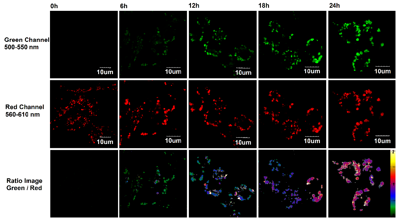 Foam-LPO染色的巨噬細胞在低密度脂蛋白刺激下的不同時間點溶酶體形態變化及熒光變化的效果圖