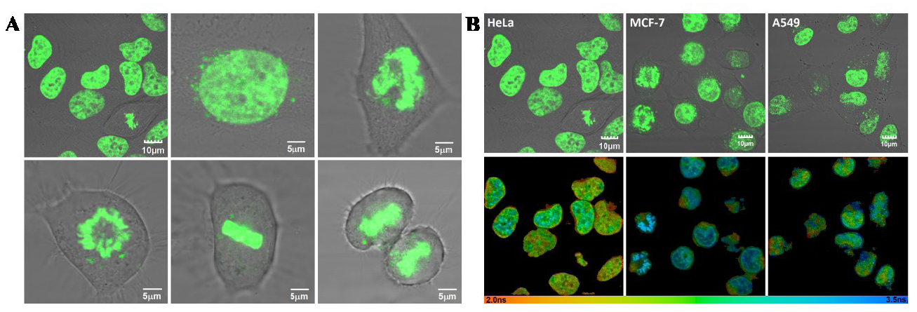 Nucleus-V染色 HeLa細胞 (宮頸癌 細胞 )的不同細胞周期( A)和不同細胞 (B)效果圖。